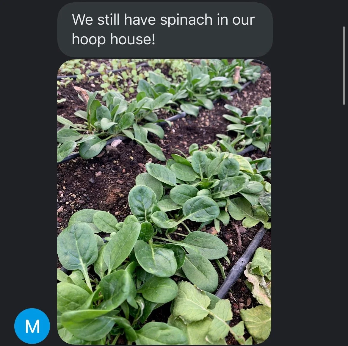 Spinach seed can germinate when the soil temperature is as low as 45 degrees. So, we typically start sowing spinach seed in our greenhouse raised beds in early February just as our day length returns to 10 hours. Then, we wait until our soil thermometer consistently reads 45 degrees for a few mid- mornings in a row to sow another planting, or succession, of spinach in our outdoor raised beds topped with mini hoophouses, typically by mid-April. This allows us to stagger our harvests and have a consistent supply through the spring once it gets too hot for spinach in our greenhouse. Our uncovered soil is usually thawed out by May and we can sow another round of spinach seed in early May. Sometimes we only get one cutting off of it because it gets heat stressed by June. Sometimes, we get more.