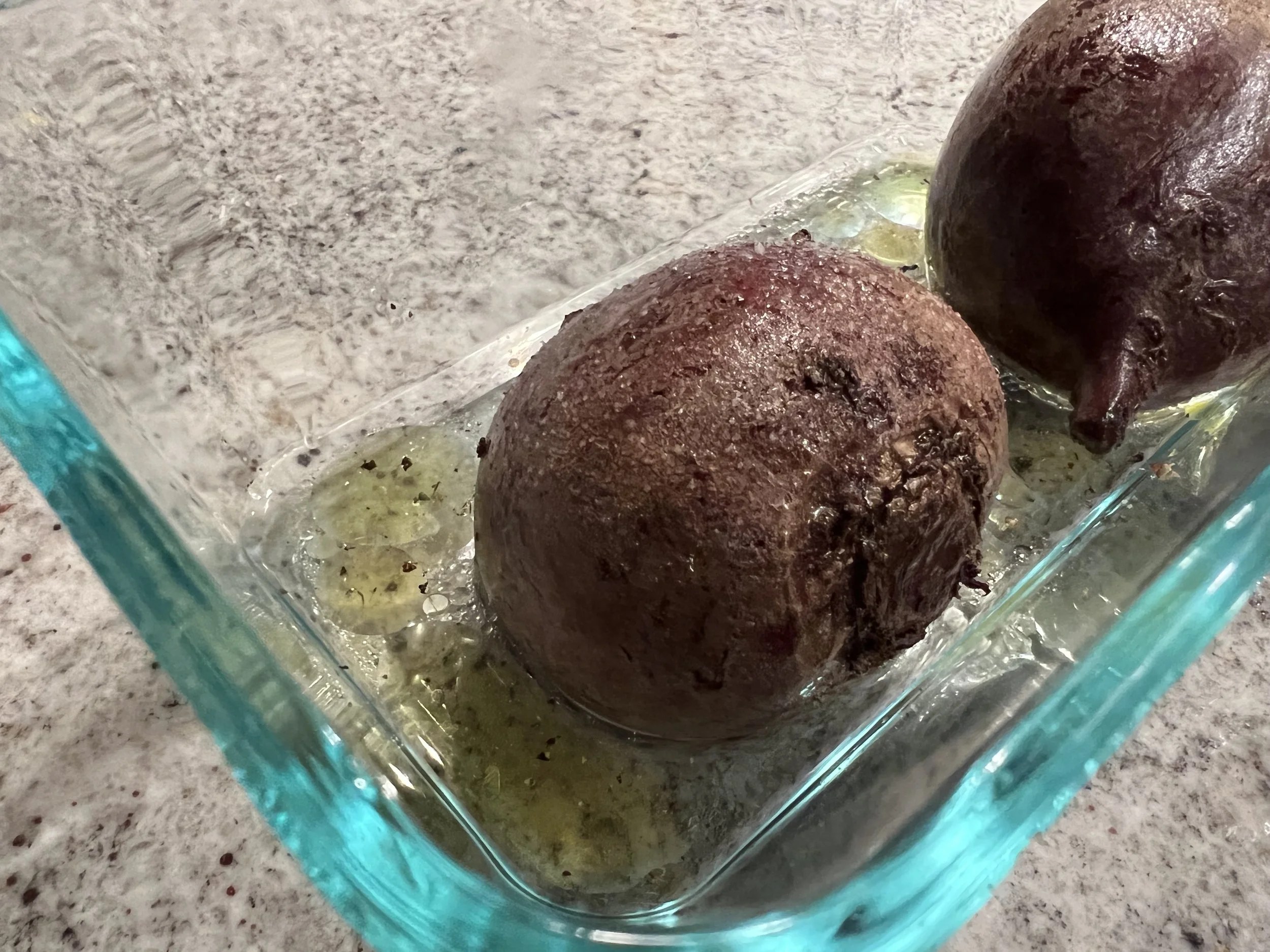 Preheat your oven to 425 degrees F and place 2 whole beets (or cut in half if they are really big), in an oven safe dish. Add a drizzle of olive oil and some salt and pepper before adding 1/4 cup water to the dish. Tightly cover with tinfoil and steam-roast in the oven for about an hour, or until tender.